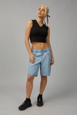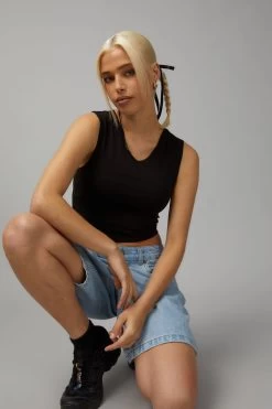 Tank style , stretch fabric , raw edge on armhole , binding details on neckline