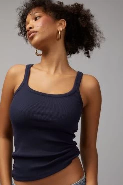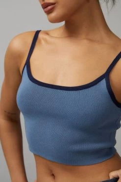 Tank style , stretch fabric , raw edge on armhole , binding details on neckline